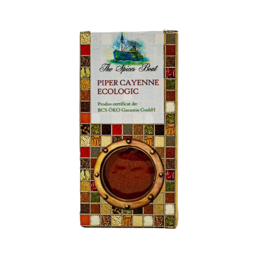 Piper Cayenne BIO, obținut 100% prin măcinarea ardeilor roșii cayenne din specia Capsicum frutescens. Conține concentrații ridicate de vitamine A și C, potasiu, calciu, magneziu, fosfor și carotenoizi. Piperul cayenne aduce beneficii importante sănătății. Are proprietăți antioxidante puternice și întărește sistemul imunitar, fiind util mai ales în caz de răceli. Susține buna funcționare a digestiei și a circulației sanguine. Accelerează metabolismul, favorizează arderea grăsimilor și detoxifierea organismului.